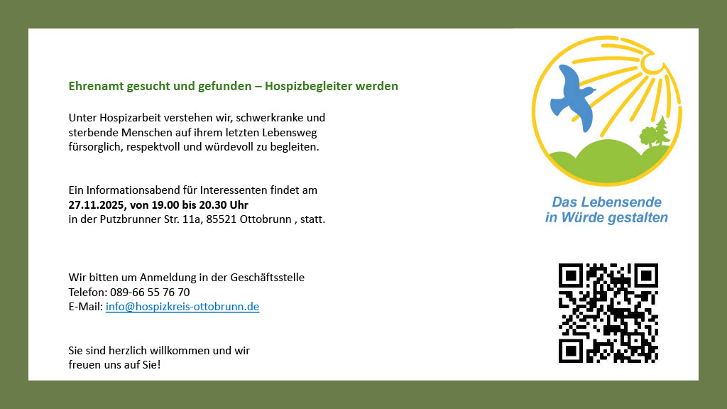 Der Hospizkreis Ottobrunn lädt alle Interessierten herzlich zu einem Informationsabend über die ehrenamtliche Mitarbeit als Hospizbegleiterin oder Hospizbegleiter ein. Die Veranstaltung findet am Donnerstag, 27. November 2025, von 19:00 bis 20:30 Uhr in der Putzbrunner Straße 11a, 85521 Ottobrunn, statt.